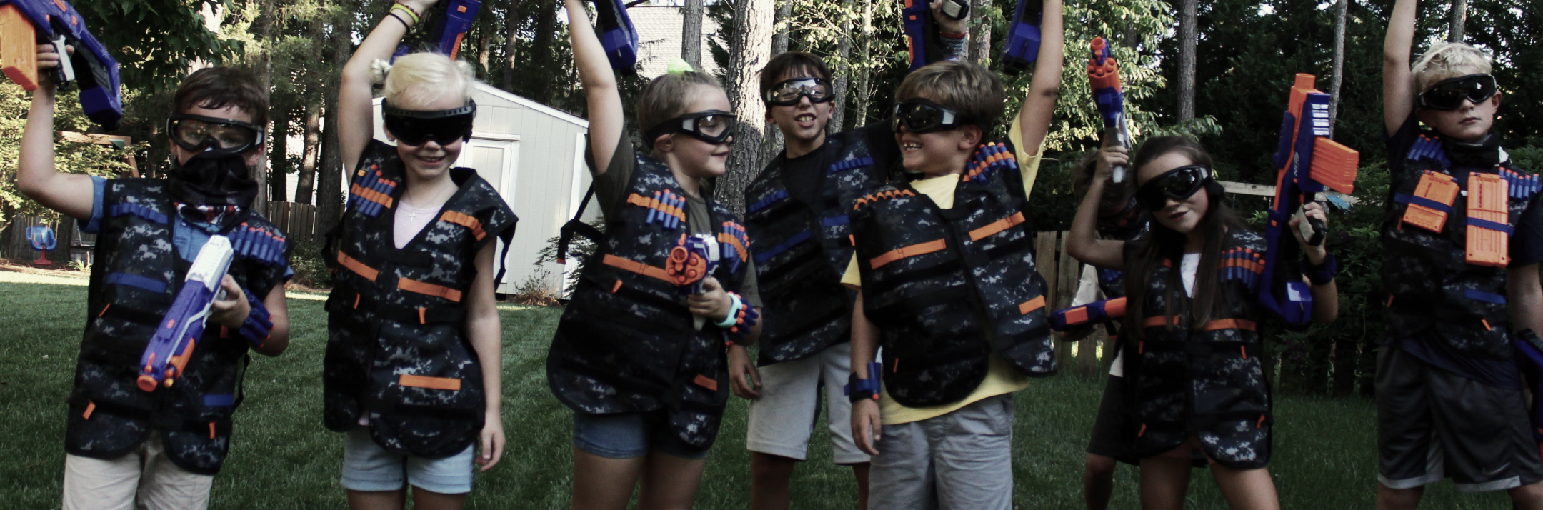 With this package you will get everything you need to have your own NERF party for up to 10 kids. This is for the Elite equipment which is best for kids ages 7-12. It comes with all the blasters, masks, vests, darts, area cones, and pop up bunkers you will need to have your party.